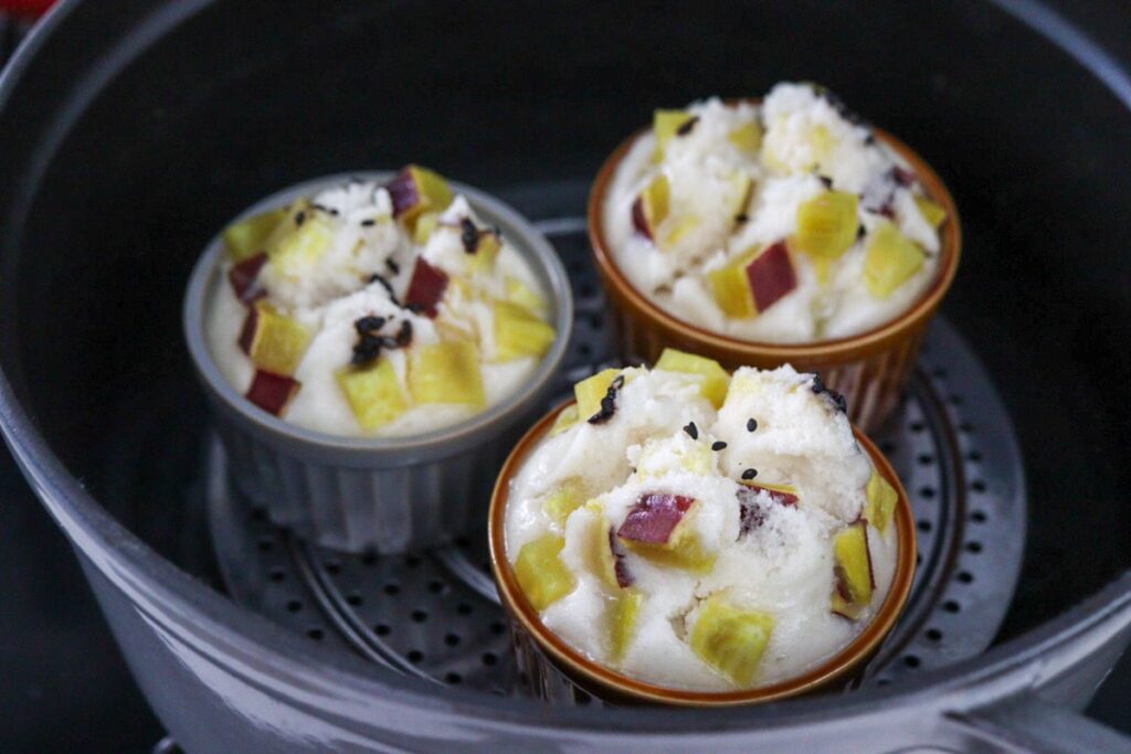 せいろで作るさつまいもと米粉で作るふわふわ蒸しパンGluten-Free & Plant-Based Sweet Potato RiceFlour Steamed Bread。