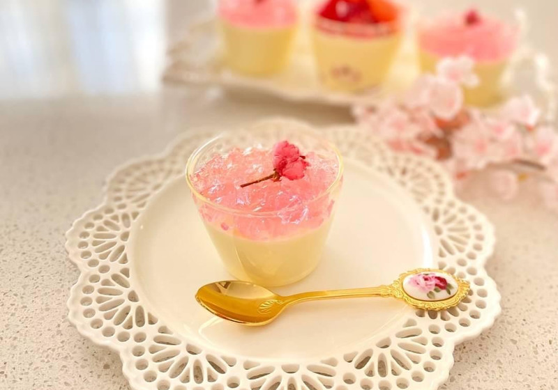 森永のゼラチンとマリーを使って、SAKURAレアチーズケーキを作りました。チーズケーキに桜あんを、上のゼリー の部分に桜の塩漬けを使っています。桜あんとクリームチーズの和と洋の組み合わせがとても美味しくエンゼルPLUS by 森永製菓。