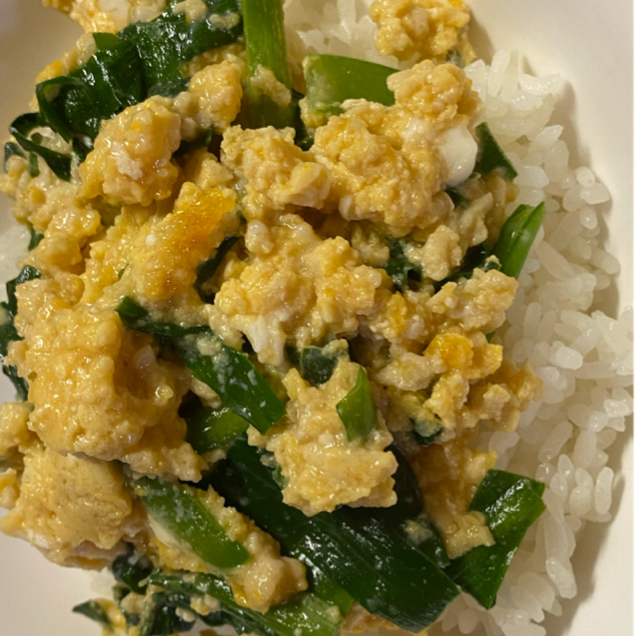 ニラと豚ひき肉のピリ辛丼。