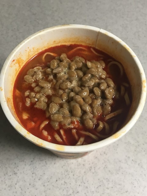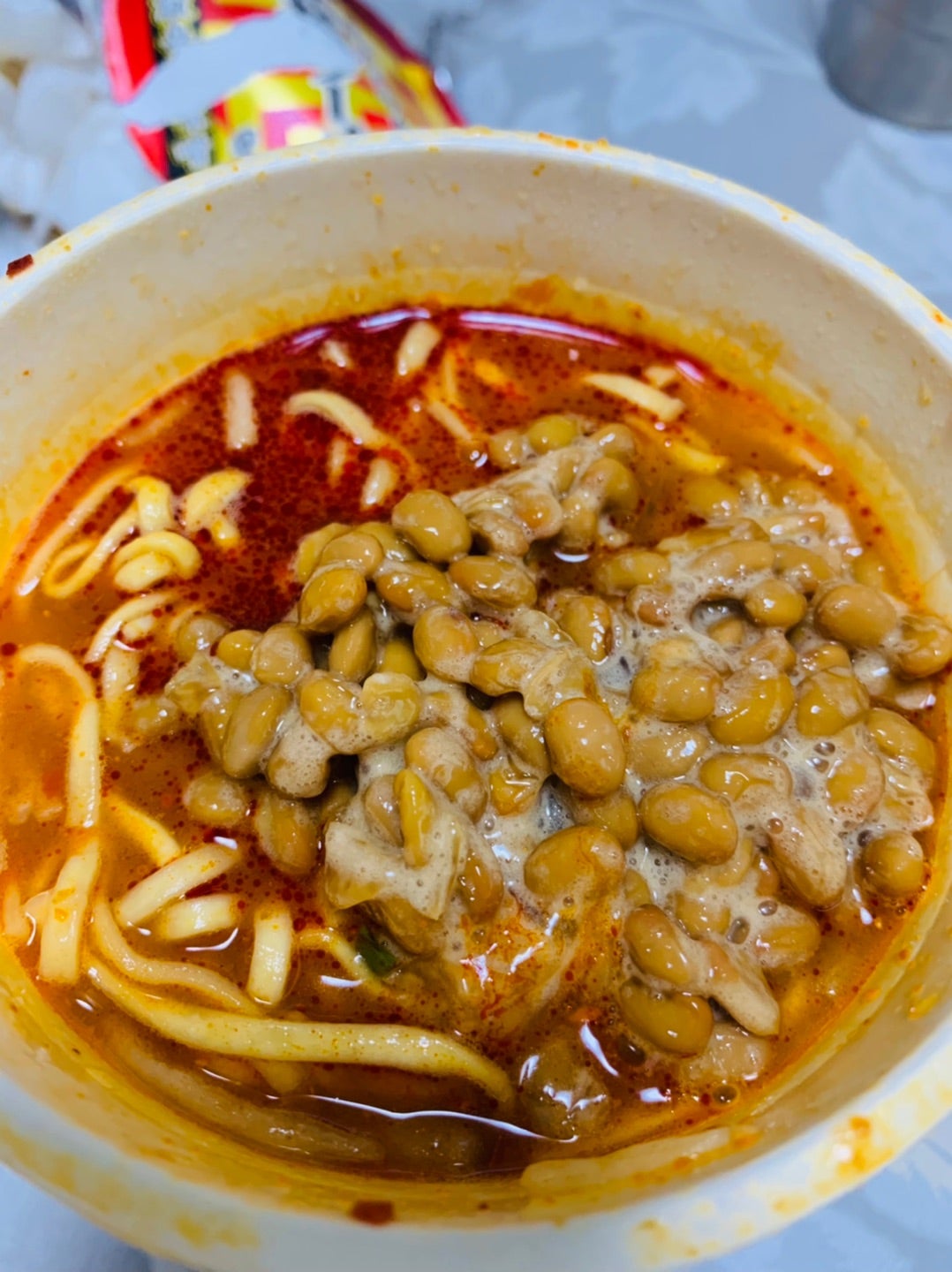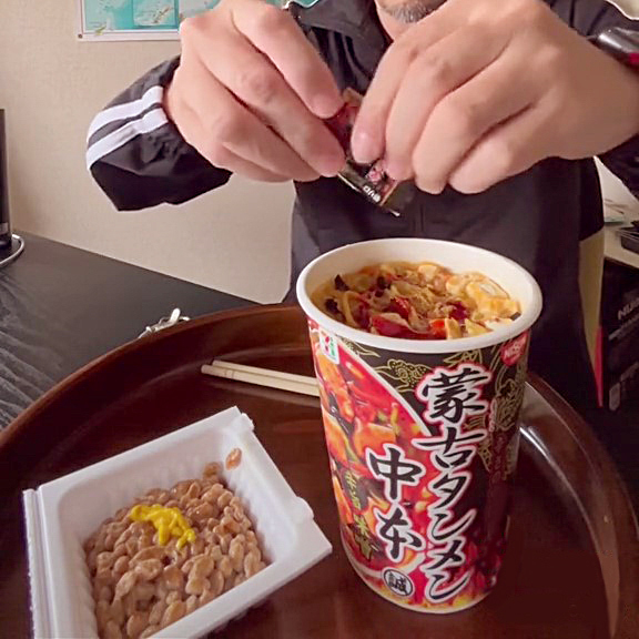 激辛カップ麺の蒙古タンメンに納豆を入れて食べてみましたけんちゃん@納豆おじさんのアレンジレシピ。
