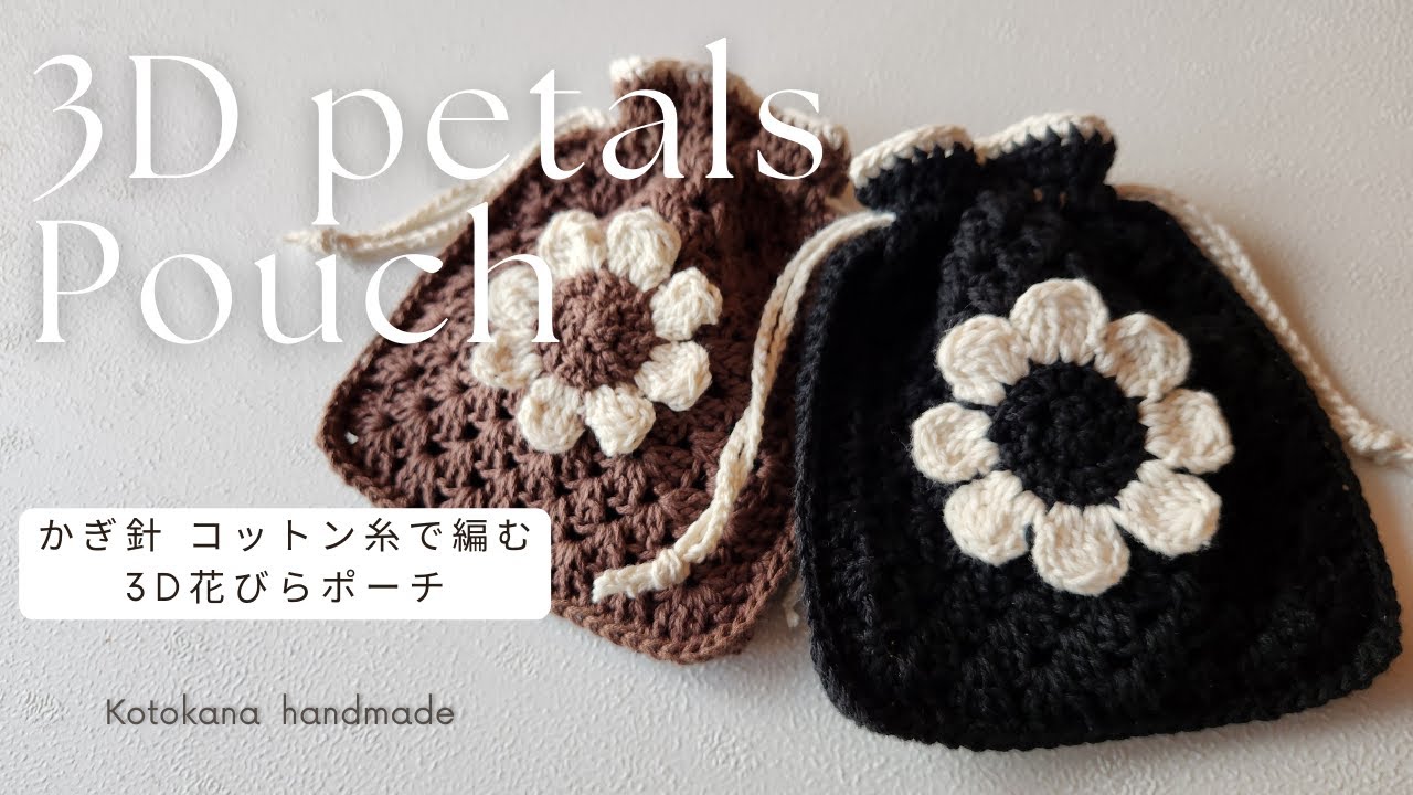 100均毛糸で編む立体花びら巾着ポーチ 編み方紹介。