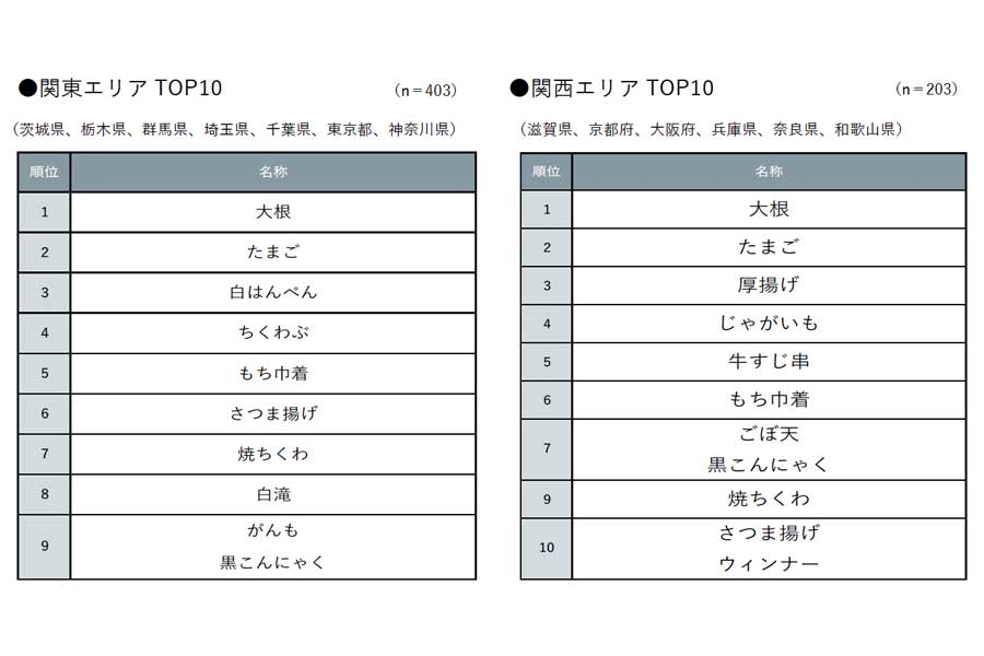 おでんに必ず入れる具材ランキング」、関西と関東の違いは?Lmaga.jp。