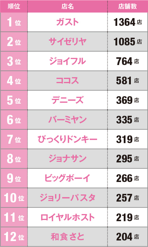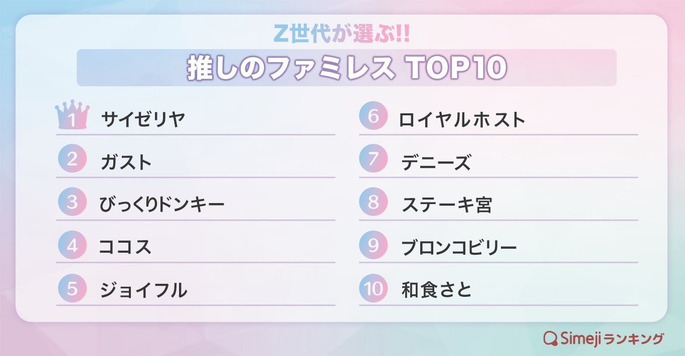 一番好きなファミレスチェーン店」ランキング - サイゼとガスト、1位はどっち? Z世代に調査マイナビニュース。