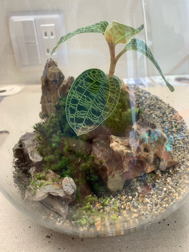 より自然に、宝石の森🌿。 □ボトルパルダリウム□ それぞれの植物が上に下へと成長しています。 より自然になってきました🤔。 ジュエルオーキッドも成長してます🌿アネクトキルスの赤味が増してきましたね。 4、5枚目のpicと動画は、 ジュエルオーキッドを枯らしてし。