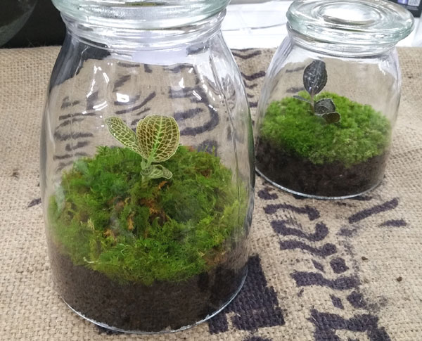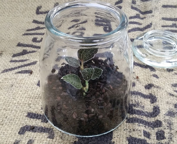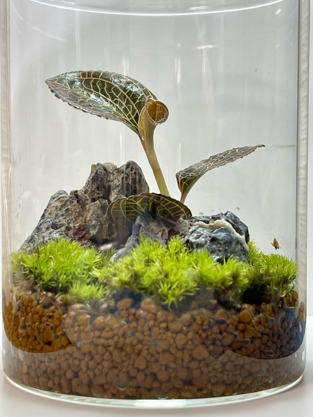 ジュエルキッドの苔テラリウム 蓋をしたボトルの中で、循環して緑の世界が楽しめる『苔のテラリウム』光輝く美しい葉で人気のジュエルオーキッド是非、手に取ってご覧ください。 「せかいのしょくぶつえん」でお待ちしています。。