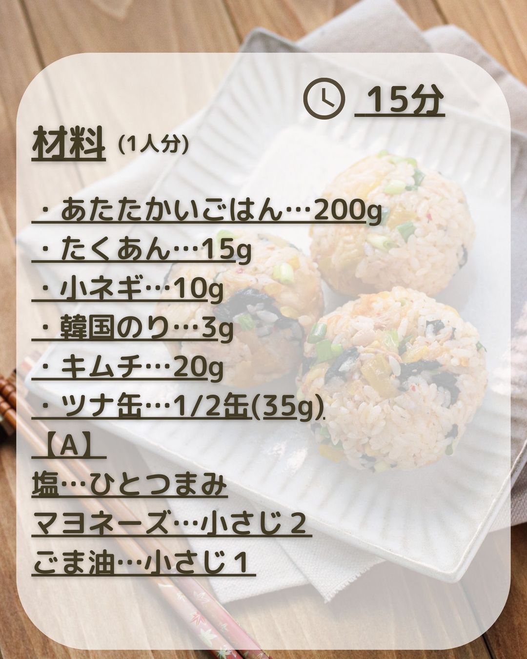👉チュモッパ 調理時間:15分 韓国料理の「チュモッパ」。やみつきになる味付けで手が止まりません! ◇材料 約10個分ごはん:400gたくあん:60g ネギ:20g 韓国のり フレークタイプ :15g とびっこ:50g マヨネーズ:大さじ2純正ごま油:大さじ1.5金いり。