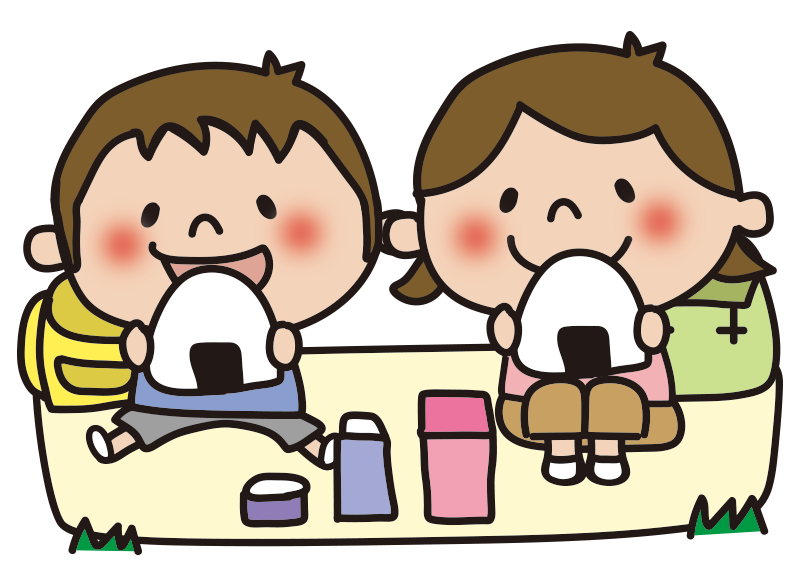 遠足でおにぎりを食べる子供たちの無料 フリー イラストかわいい手描きの無料素材「てがきっず」保育園・小学校・介護施設にぴったりのフリー素材イラスト。