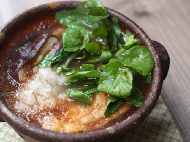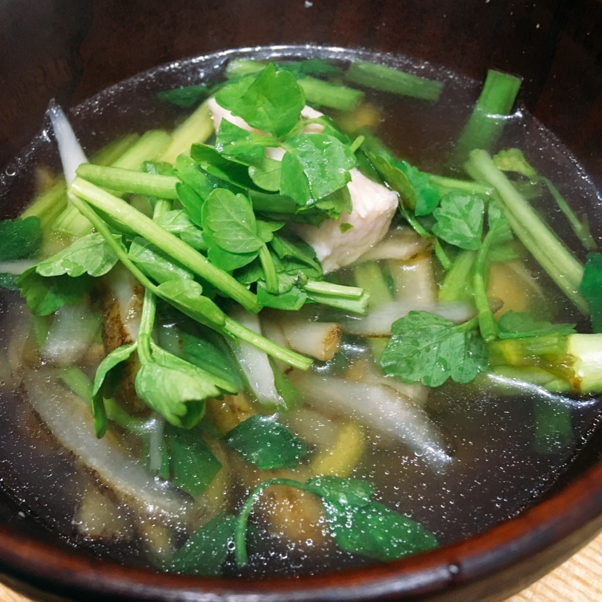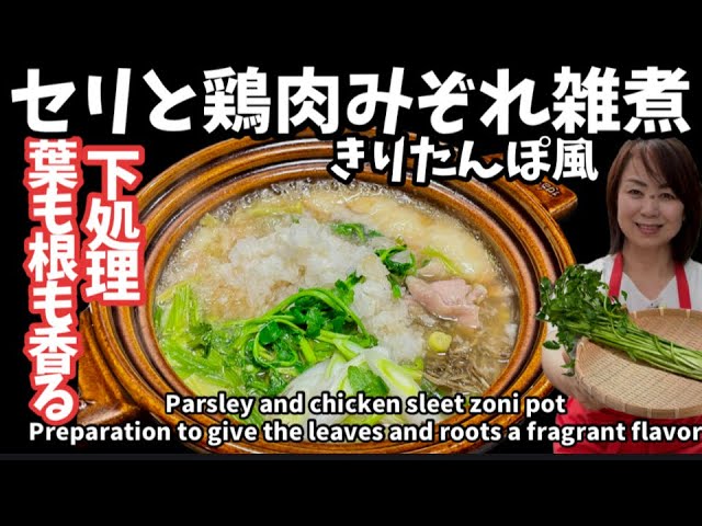 165.セリと鶏肉みぞれ雑煮 きりたんぽ風 セリの下処理葉も根も香る - YouTube。