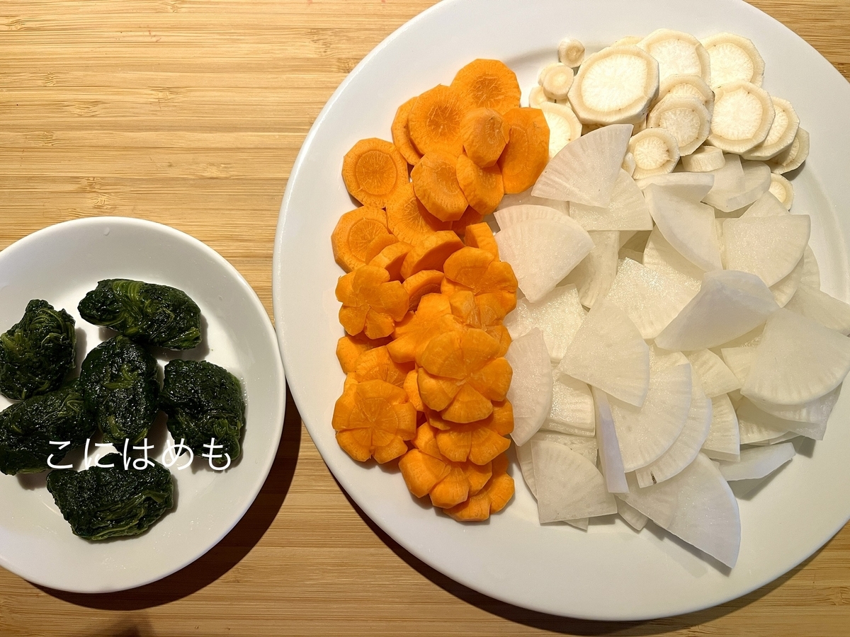 ハンガリーで作る!昆布とかつおだしの「お雑煮」包丁で作る人参の飾り切り「ねじり梅」作り方・レシピ。 - こにはめも。