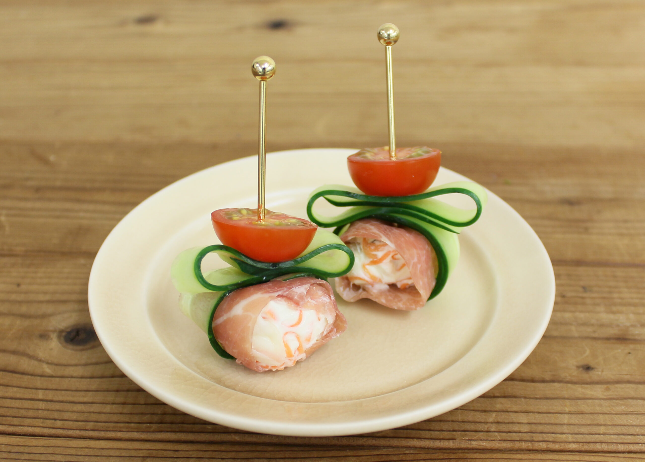 スモークサーモンとクリームチーズのきゅうり巻きサラダ。