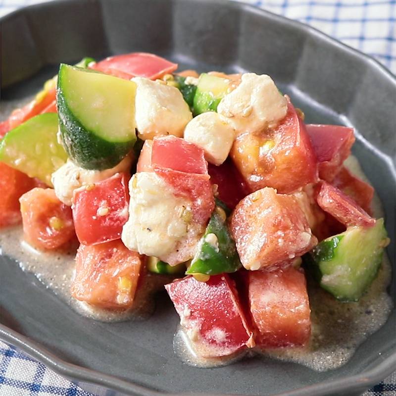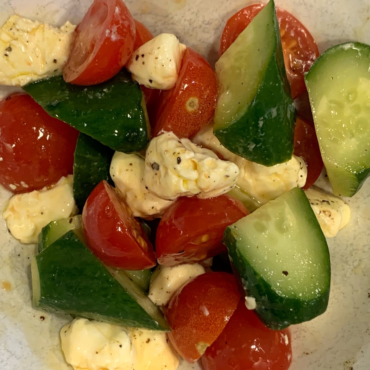 きゅうり トマト クリームチーズの彩りダイスサラダ自家製ピクルスを添えて RemySnapdish スナップディッシュID:m10yba。