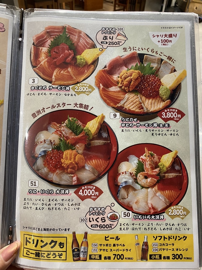 おはようございます🌞 海鮮丼大江戸でございます メニュー改定に伴って、店前のメニュー看板も新しくなりました! 残念ながら、『かに爪のいただき丼 』と『炙り本マグロ大トロのいただき丼』は販売終了となりました。😭 カニ爪ロスは、トッピングでカバーしたいと思います。