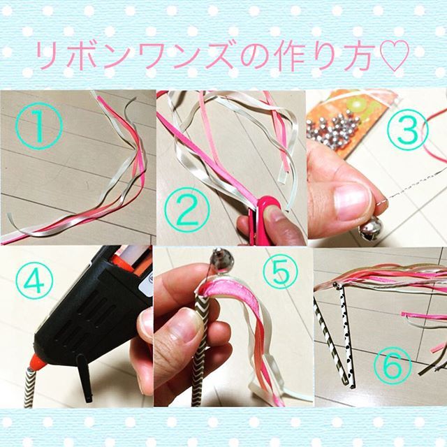 リボンワンズの作り方を教えてくださいという嬉しいコメントを頂いたので作り方アップします٩ ○˙▿˙○ ۶ ①リボンを40センチくらいの長さにカットします。②同じ長さに切ったリボンをホチキスでとめます。 ③針金を5センチくらいの長さに切り、鈴を通しねじります。 ④。