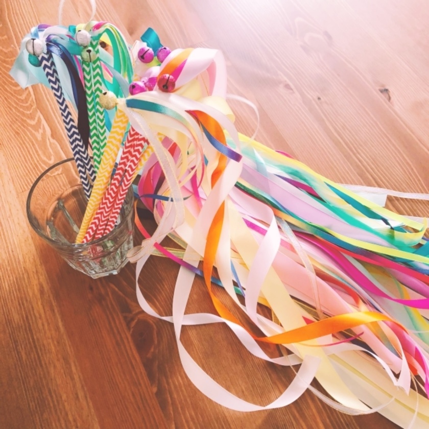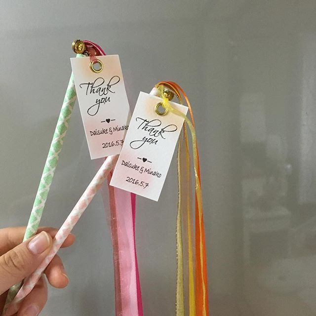 結婚式DIY𓂃𓈒𓂂𓏸 今回はリボンワンズ の作り方のご紹介❁⃘*.゚ ドレスの色当てに✨ 名前をつけて子供用の席札にも✨ DIY手順📃 ➀リボンを好きな長さでカット ➁ストローの先端にリボンをつける ➂鈴やタグなど好きなモチーフをつけて完成 リボンや。
