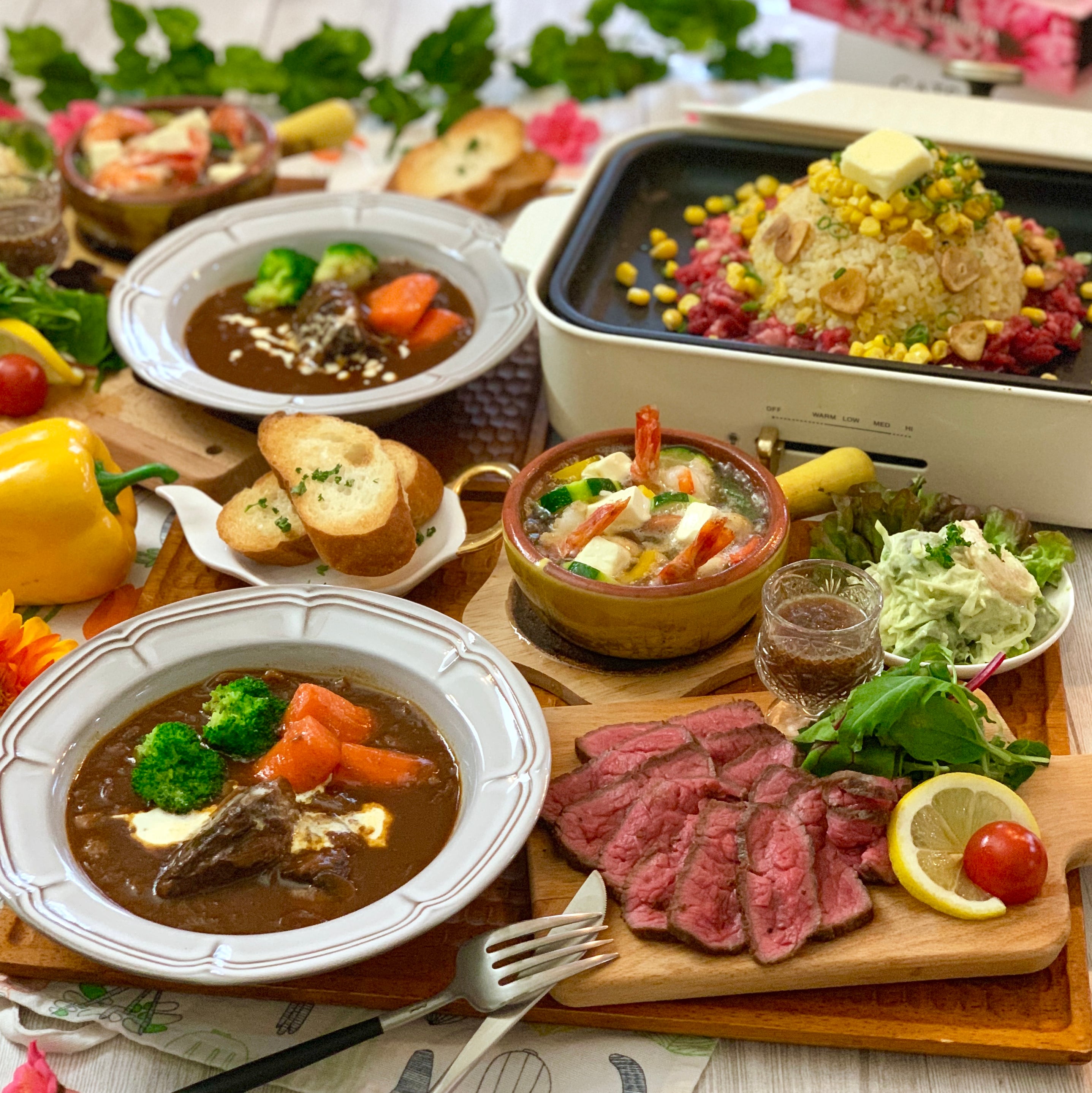 ビーフシチューパエリアチキンの唐揚げ生ハム チーズ盛りポテトサラダウィンナー粒マスタード添え みゆSnapdish スナップディッシュID:D9ySCa。
