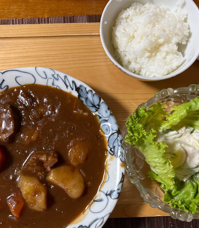 今日の夕食です。 ビーフシチュー サラダ フランスパン ベーコンエッグパン てりたまチキンパン です。 妻が美味しく、調理してくれました。料理ができるまで、仮眠して休む事もできました。 栄養をつけてくこうやん。