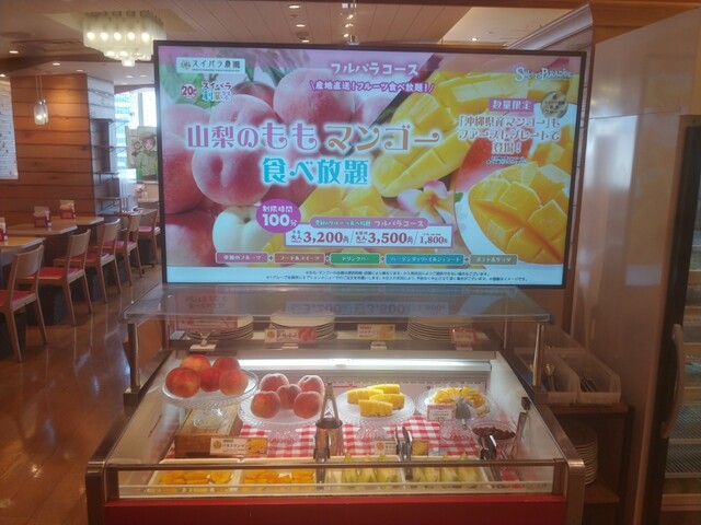 ☆大阪府大阪市天王寺区にある『スイーツパラダイス 天王寺ミオ店』の季節限定の『『フルパラコース 国産もも・アールスメロン・マンゴー食べ放題沖縄県産マンゴー登場! 』です ☆This is the seasonal "Fru Para CourseAll-you-can-eatdomestic peaches, Earl's。