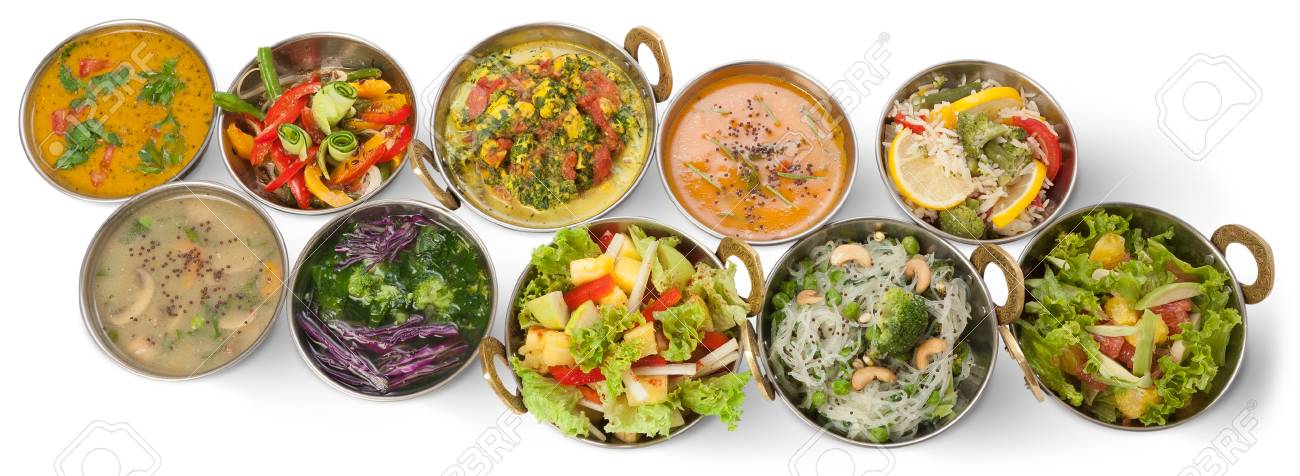 ビーガンやベジタリアンのレストラン料理、スパイシーなインド ホットスープ、米、銅ボウルでサラダ。伝統的なインド料理の食事の品揃えは、白い 背景で隔離。健康的な東部郷土料理の写真素材・画像素材 Image 67624907。