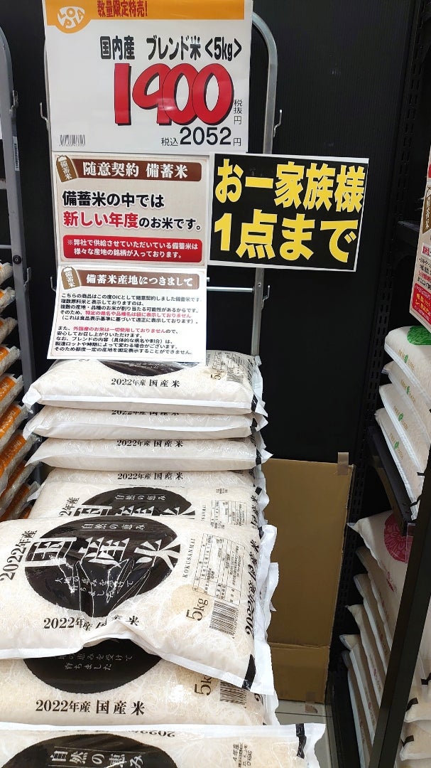 ロピアの相模原市橋本店で見つけました。 税別で、1,900円でした。 備蓄米を初めて購入出来ました。味は判りませんが値上がり前は、これくらいの値段だったのに。 今年の秋も不作らしいから値下りは期待出来ない感じでしょうか。
