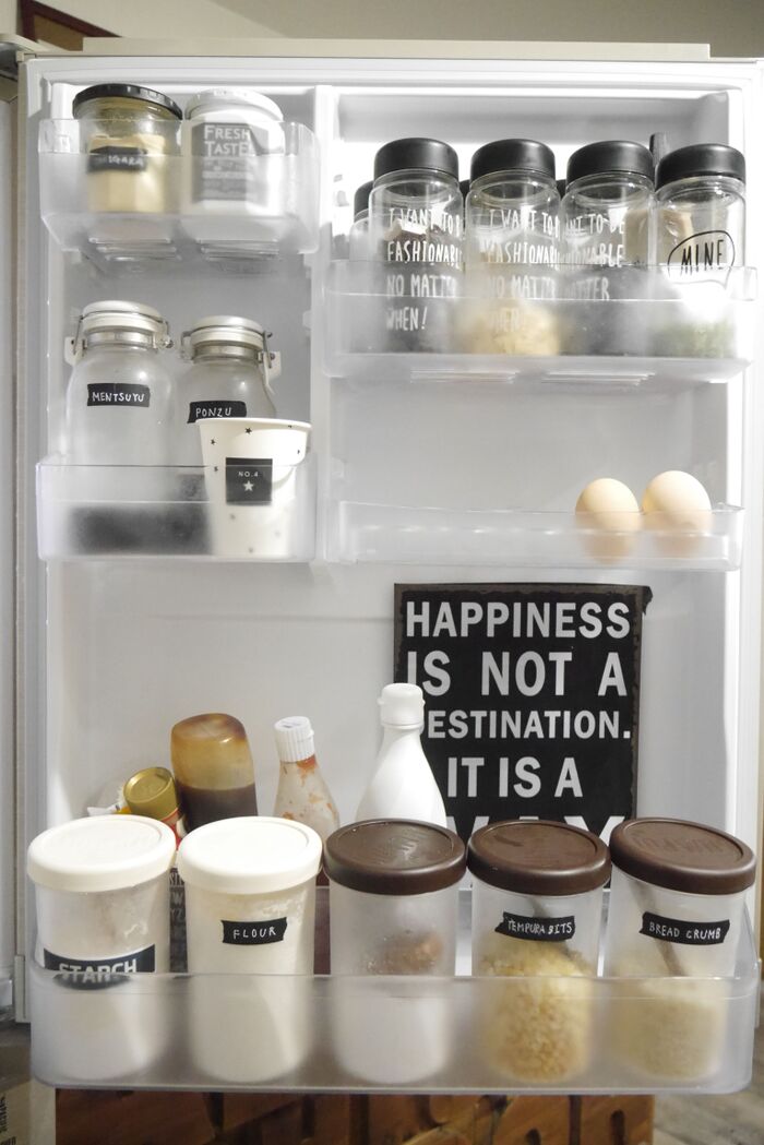 冷蔵庫収納*ブログ初公開 ニトリグッズで調味料や粉ものを整理!後悔しないおしゃれな一戸建てを建てるためのブログ☆。
