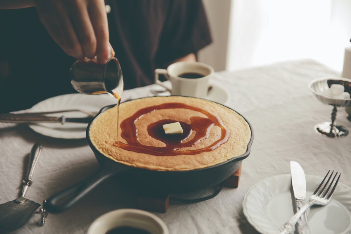 スキレットで楽しむバター&メープルたっぷりホットケーキ🥞。