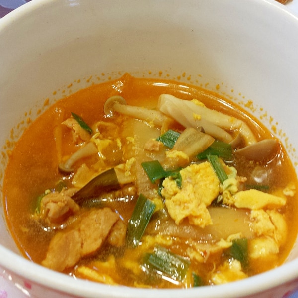 5分で作る♪ ふわふわ卵のキムチスープ。