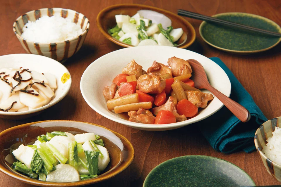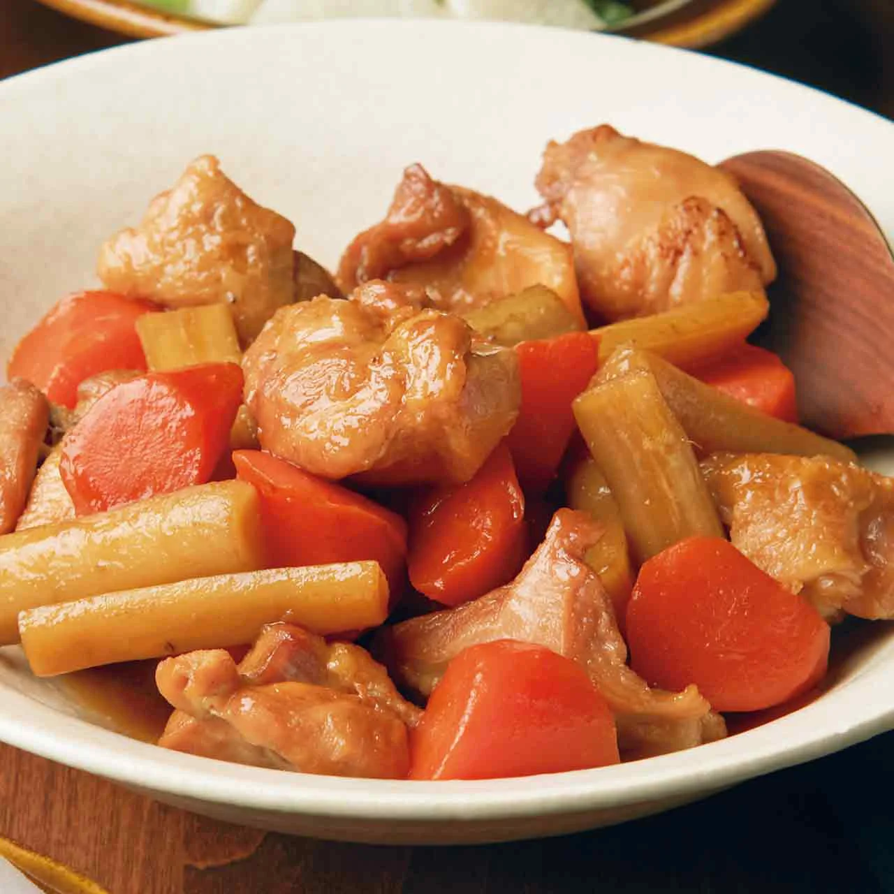 食べ応えバッチリ! 鶏肉と根菜のさっぱり煮。