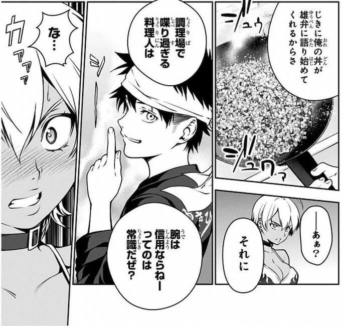 調理場で喋りすぎる料理人は 腕は信用ならねーってのは 常識だぜ? 食戟のソーマ。