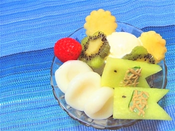 メロンこいのぼりで華やかに!白玉フルーツパフェ。
