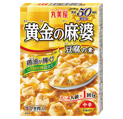 麻婆豆腐の素<甘口><中辛><辛口><大辛><鶏しお味>』2021年1月 リニューアル発売 『期間限定 黄金の麻婆豆腐の素』2021年1月14日 木 ~2022年3月31日 木 期間限定販売丸美屋食品工業株式会社のプレスリリース。