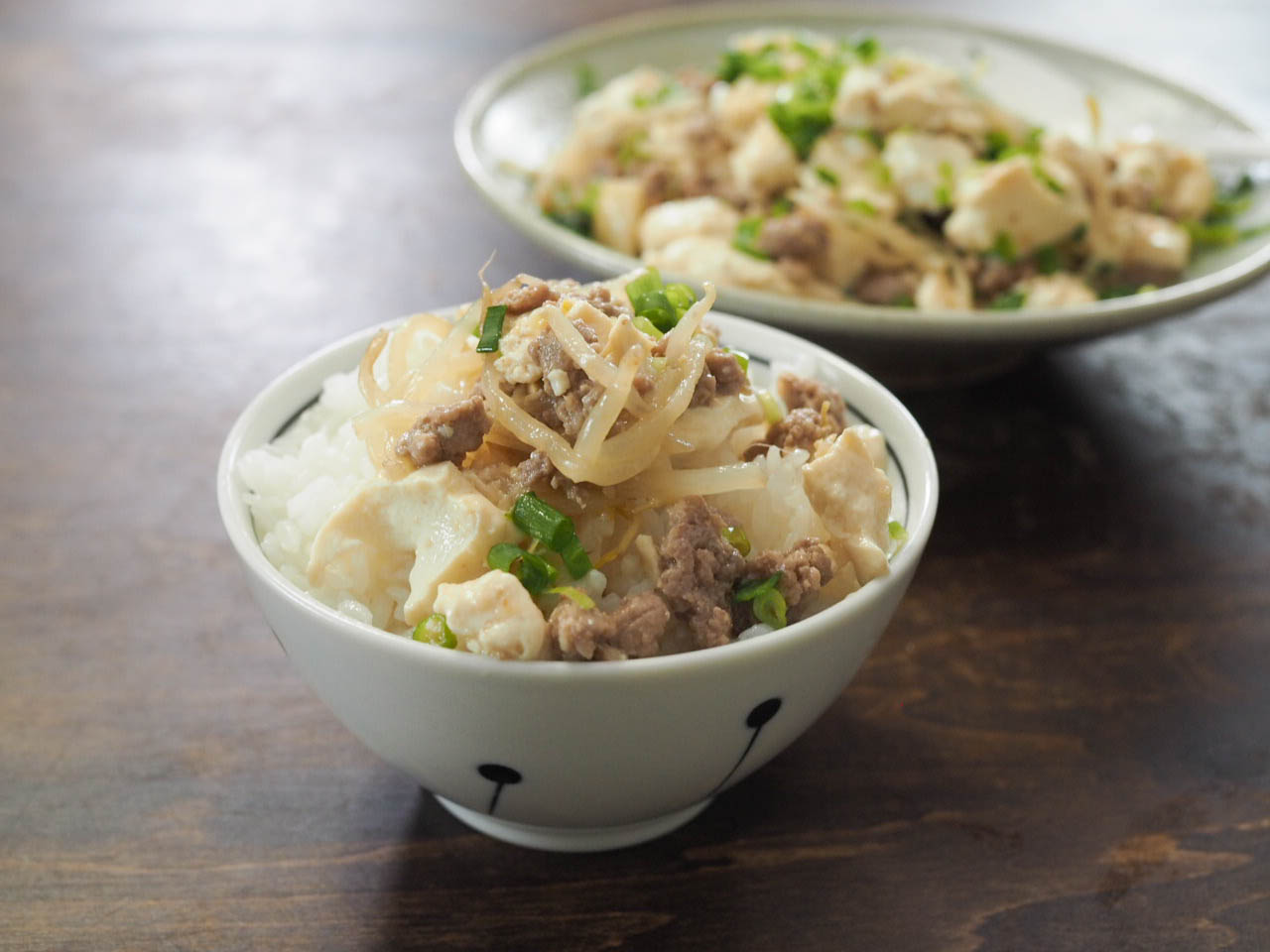 豆腐ともやしの中華風味噌煮のぶっかけごはん奥薗壽子のなべかまぺえじ。