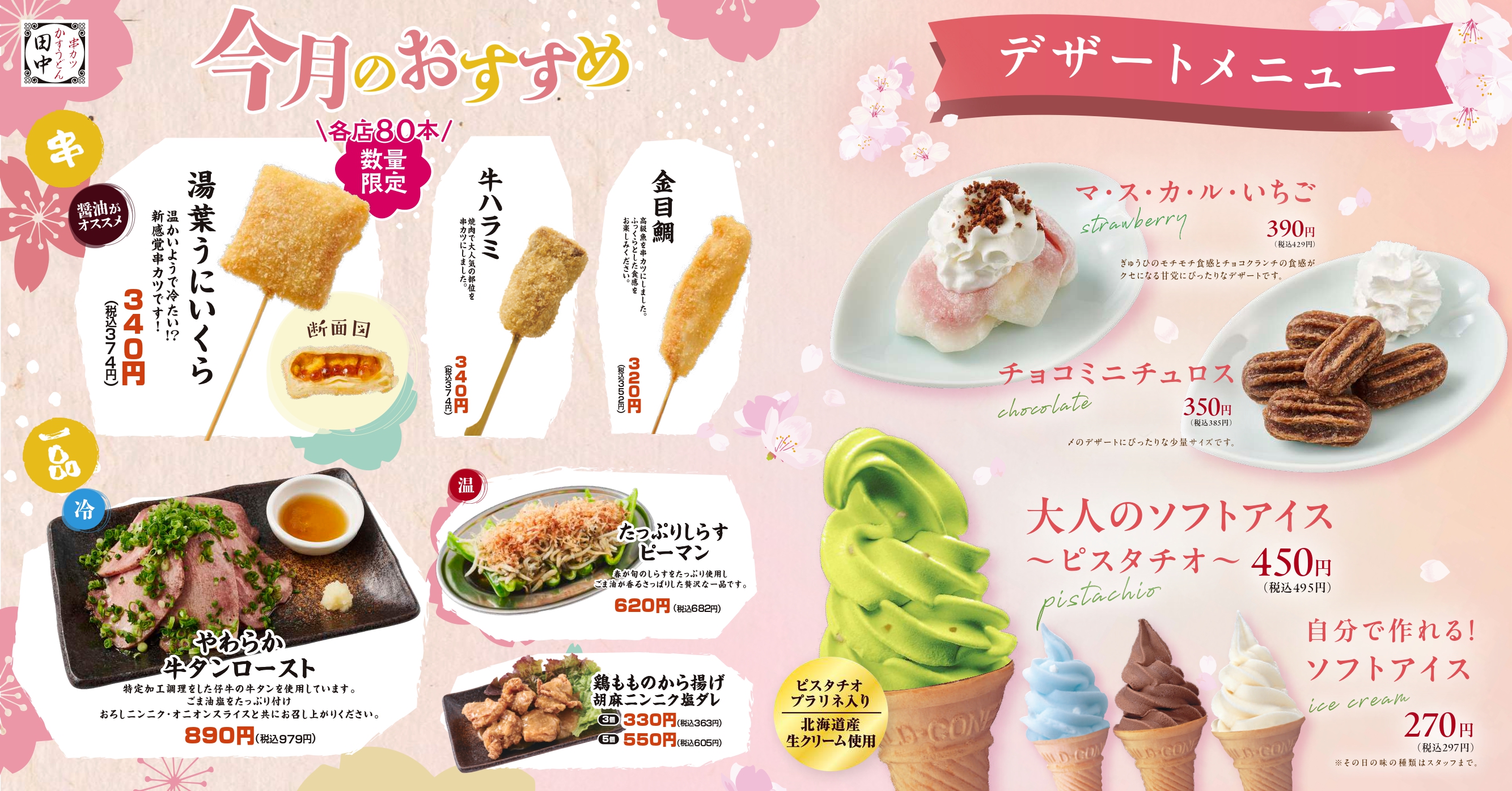 春の新メニューは合計24種類! 季節のおすすめメニュー12種類、新グランドメニュー12種類が3月28日 木 より販売開始! 2024 03 27お知らせ 串カツ田中 公式。