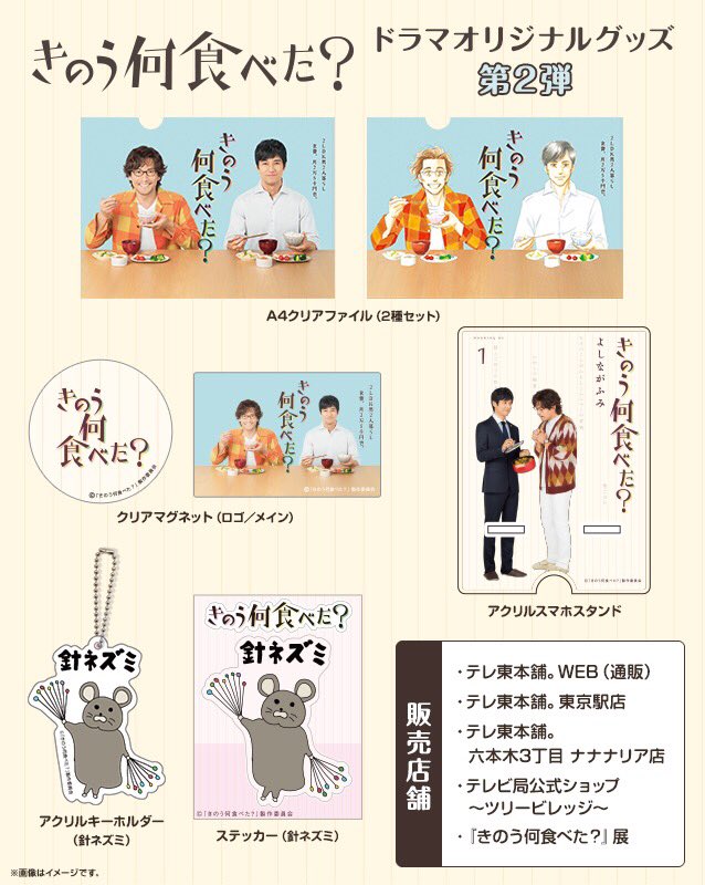 きのう何食べた? season2』 公式 on X: "ドラマオリジナルグッズの第2弾が発売決定です!こちらは「きのう何食べた?展」限定グッズ ではなく、「テレ東本舗。」の各店舗やWEBでの通販も可能なグッズです。販売時期はまたお知らせしますね。きのう何食べた? https:t。