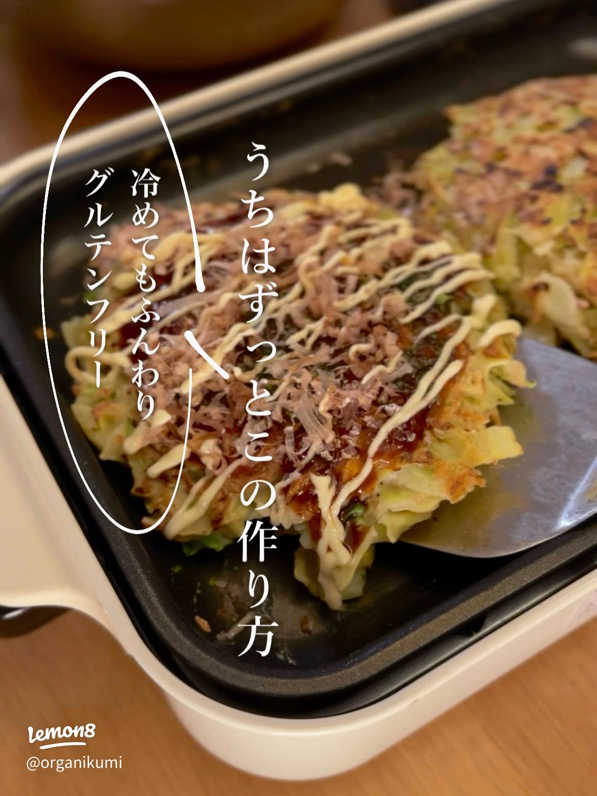 グルテンフリー米粉と豆腐でもち食感お好み焼き。