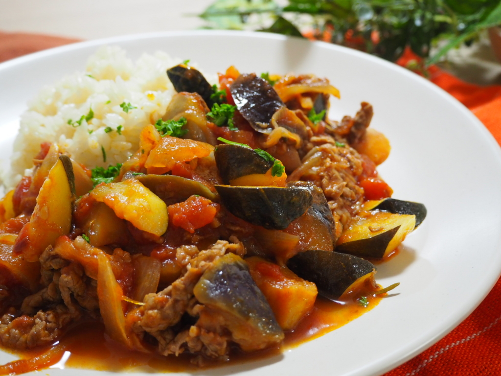 牛肉となすの和風トマトカレー煮。