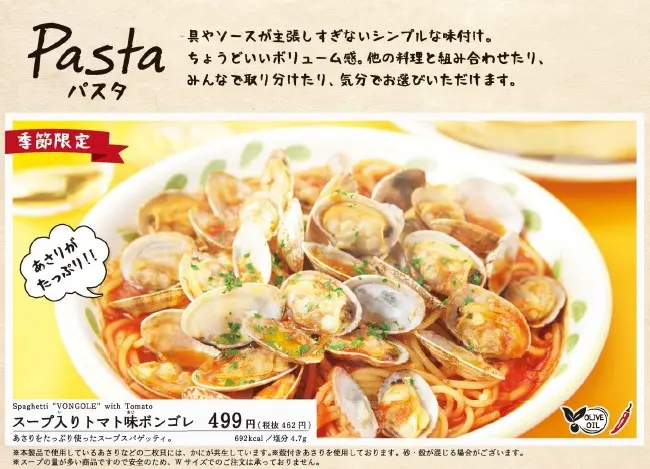 サイゼリヤ 季節のメニュー「スープ入り塩味ボンゴレ」Japan Course日本語。