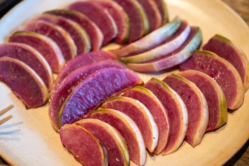 色大根のたたき梅和えHOMEMAKERS Farm & Cafe小豆島、有機野菜・ジンジャーシロップ。