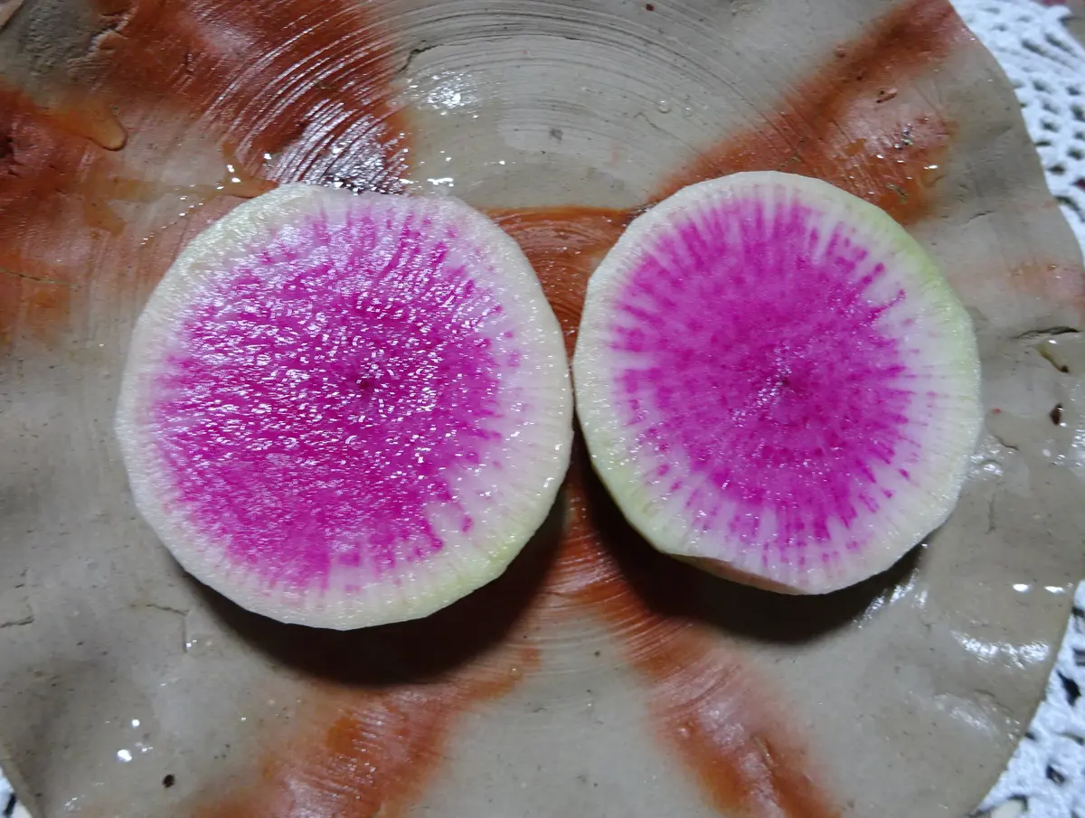 第2回 大根の仲間紹介👏 紅紫色と白色で上品で美しい姿の"京むらさき大根"です🌿 みずみずしくて🤤辛味がマイルド🫶 サラダや野菜スティックにぴったり🥗紫色 アントシアニン がお酢やレモン汁 酸性 に漬けると赤色に変身😳 そんな変化を楽しみながらのお料理もいかが。