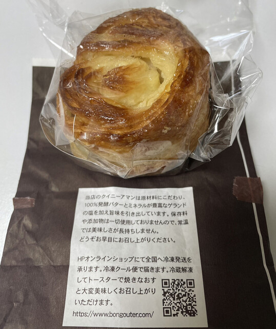 他の投稿は→ @bongouter2011商品名クイニーアマン値段¥330 税込¥356こだわりボン・グーテのクイニーアマンは、発酵バターを100%使用し、フランス産のミネラル豊富なゲランドの塩を加えて二日かけて仕上げています。外側はザクっと、中はしっとり。