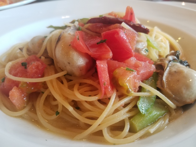 「ヒルナンデス」白と赤のナポリタンうどん。