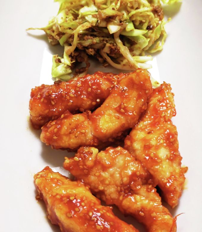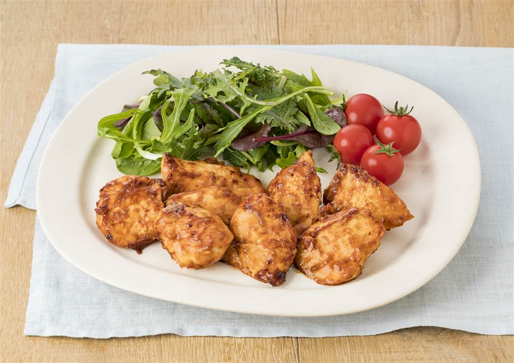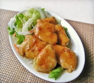 ごま油風味の鶏胸肉のケチャップ焼き♪。